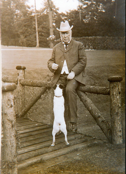 Mr John Inett Ward is standing on a bridge presumed to be located over the linear feature marked as 'Moat' on older maps. This can barely be discerned today between the Community Centre and the Tennis Courts.